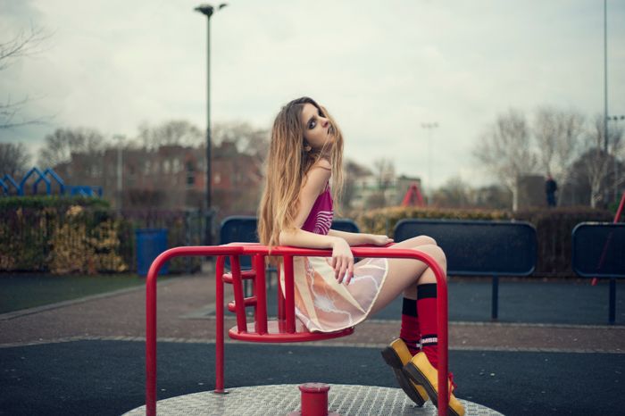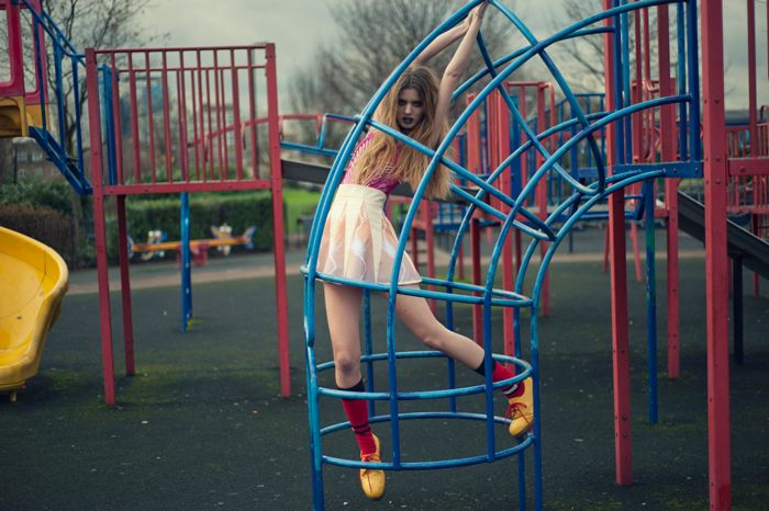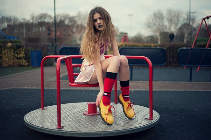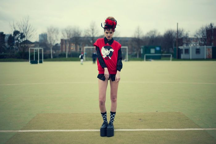 Swimsuit and skirt by Rainbow Winters, Dr Martens shoes and Umbro socks.