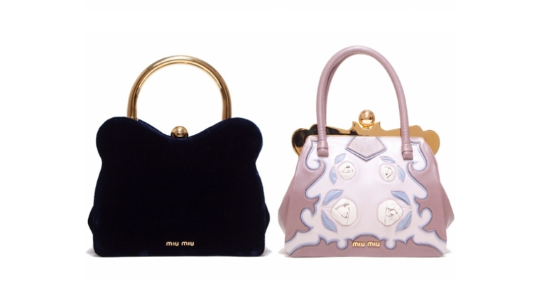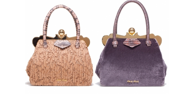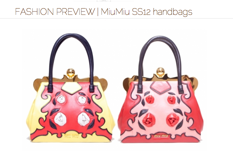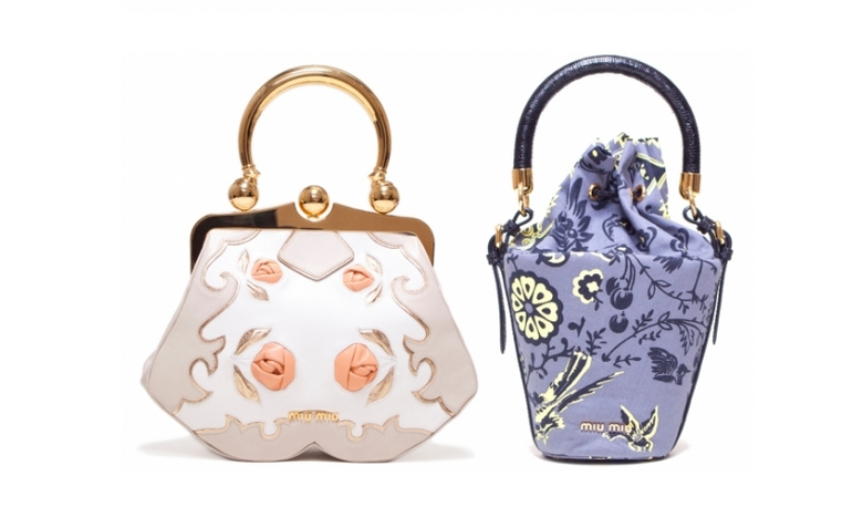Look at these beautiful creations! The classy bag with a vintage flair is a spring/summer trend. Together they form a rainbow parade of coloured leathers and different tones of satin. Unique shapes decorated with floral patchwork, roses and leather ornaments. This is a feminine, sensual collection introduced by Miu Miu for Spring/Summer 2012.