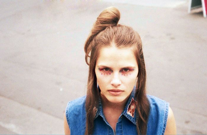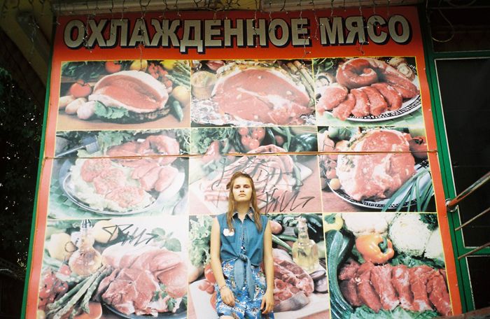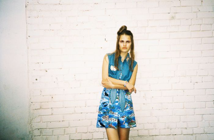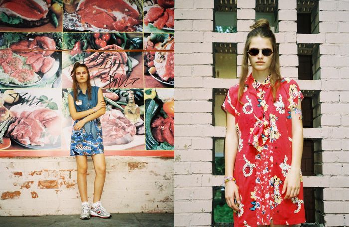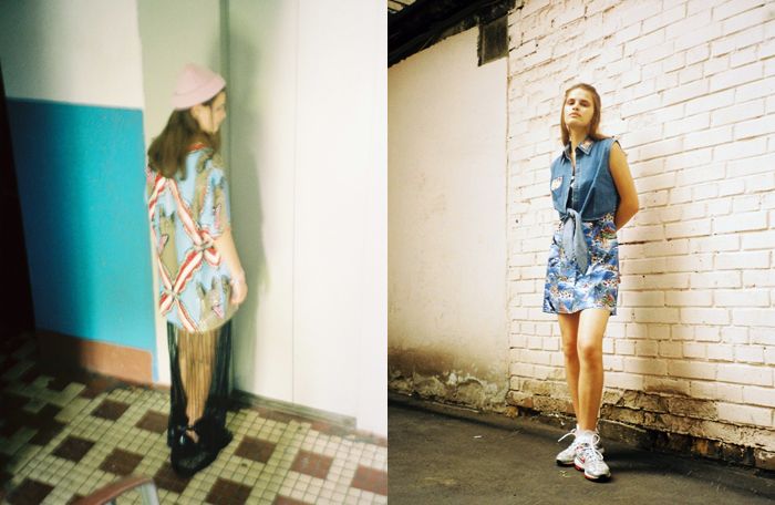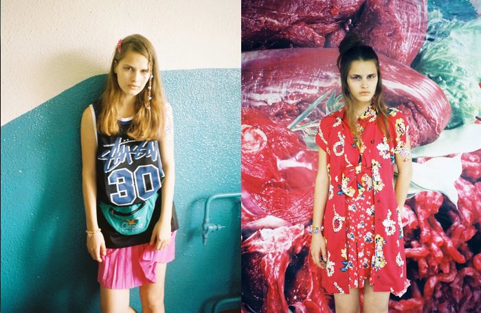 On the left picture Yulianna wears jeans top by Motel, dress by Alice, socks and sneakers – model’s own.