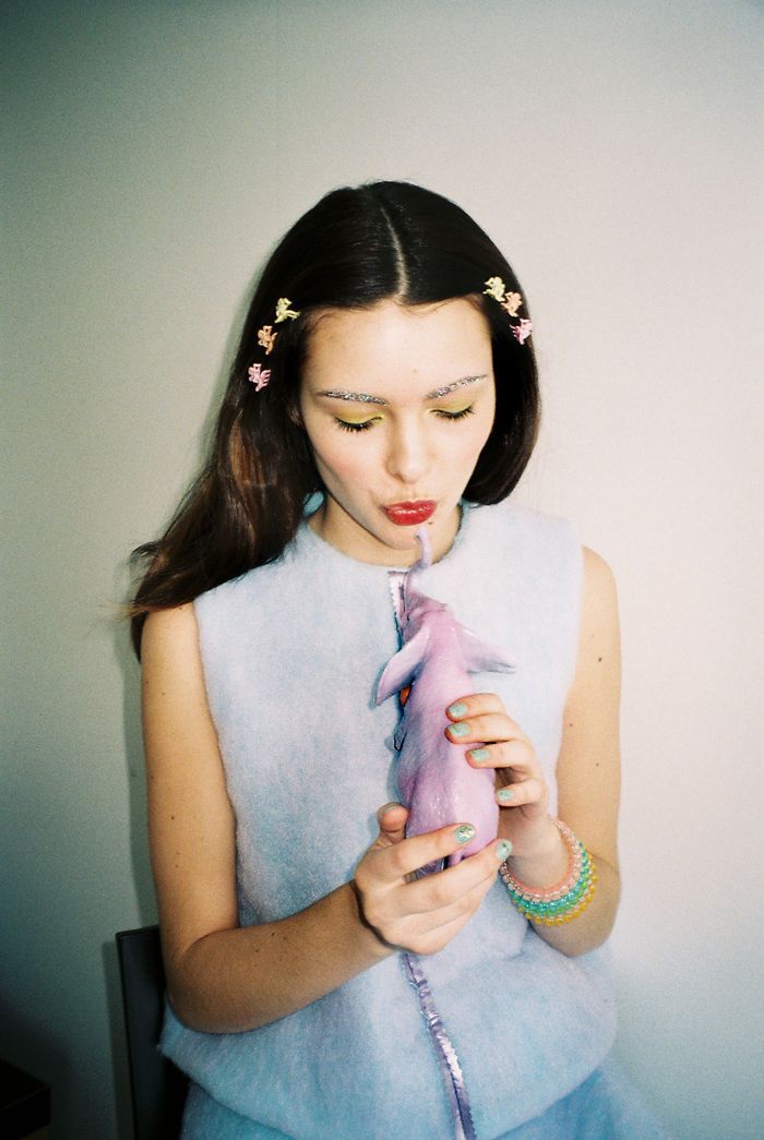 Her final year collection includes a series of studded silicone backpacks and bespangled platform trainers, triggering memories of Velcro trainers with flashing lights from one’s childhood days. Single-strap aprons worn sideways and long-sleeved sheepskin tops and dresses crafted of her bespoke hand-dyed technique bore magnificent brights of neon. Together with leather-strap bondage belts and teddy bear accessories, the collection was a combination of mature femininity with a lighter touch of insouciance. It expressed the struggle of growing up.